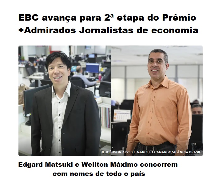 ,A Agência Brasil, a Radioagência Nacional e profissionais da Empresa Brasil de Comunicação (EBC) avançaram para a segunda fase do Prêmio +Admirados Jornalistas de Economia 2025. Edgard Matsuki (à esquerda) e Wellton Máximo concorrem com nomes de todo o país. A Agência Brasil disputa na categoria Agência de Notícias, enquanto a Radioagência Nacional concorre na categoria Sites ou Portais. Além disso, a produção Tira-Dúvidas do Imposto de Renda está entre as indicadas na categoria Áudio (Programa de Rádio/Podcast).