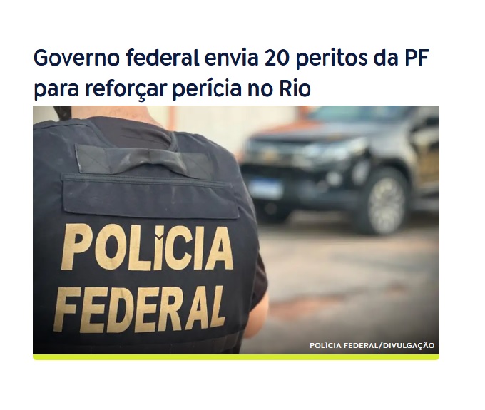 | 05:22h | NotíciasVinte peritos criminais da Polícia Federal vão reforçar os trabalhos de segurança pública no Rio de Janeiro, conforme comunicou, nesta quinta-feira (30), o ministro da Justiça, Ricardo Lewandowski ao governador do Rio de Janeiro, Cláudio Castro.